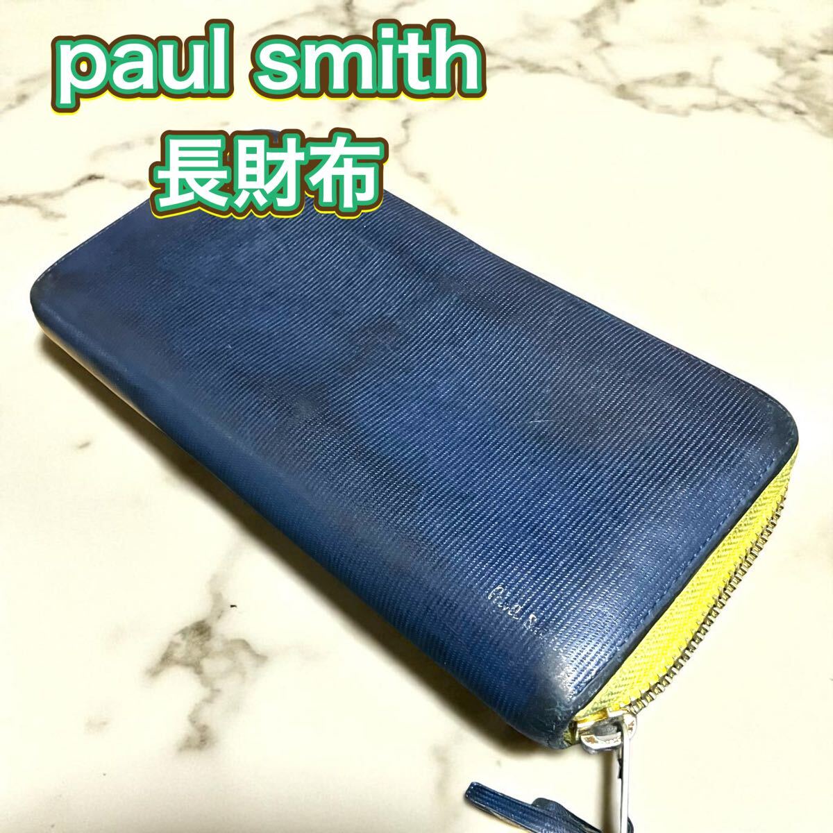 - Paul Smith 長財布 ラウンドジップ ネイビー イエロー レザー ラウンドファスナー ジッピーウォレット ラウンドファスナー長財布
