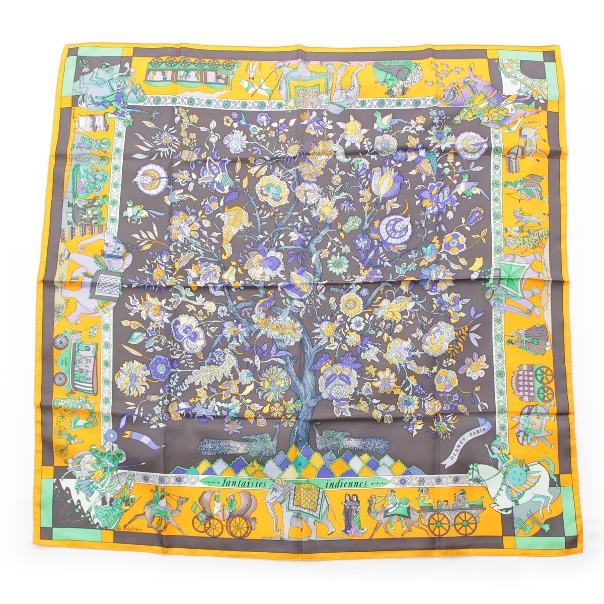 > エルメス カレ90 シルク Fantaisies indiennes 眩惑のインド スカーフ グレー オレンジ マルチカラー【中古】