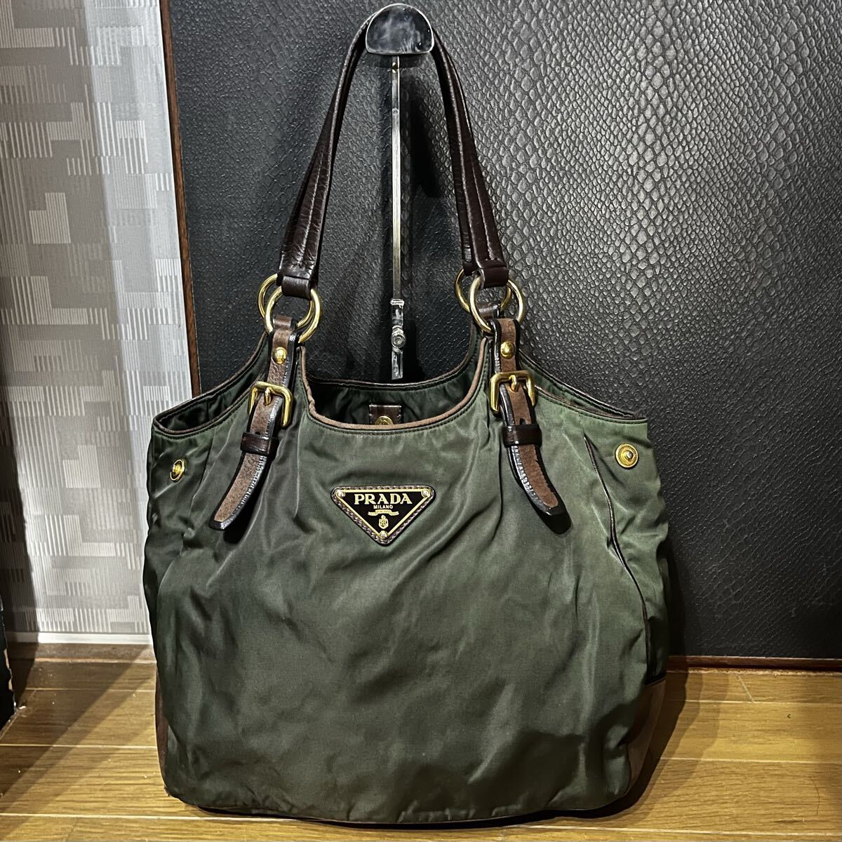 - 1円〜 PRADA プラダ トートバッグ ハンドバッグ 肩掛け カーキ 三角ロゴ ブラウン ナイロン レザー