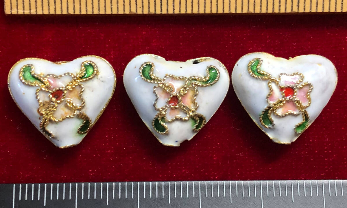 > ¶!¶ 有線七宝焼ワールド - 3個のハート型ペンダント ¶!¶ 約厚8㎜×横17㎜×縦15㎜ 金線に白釉 手作り 手芸 工芸 インテリア ペンダント