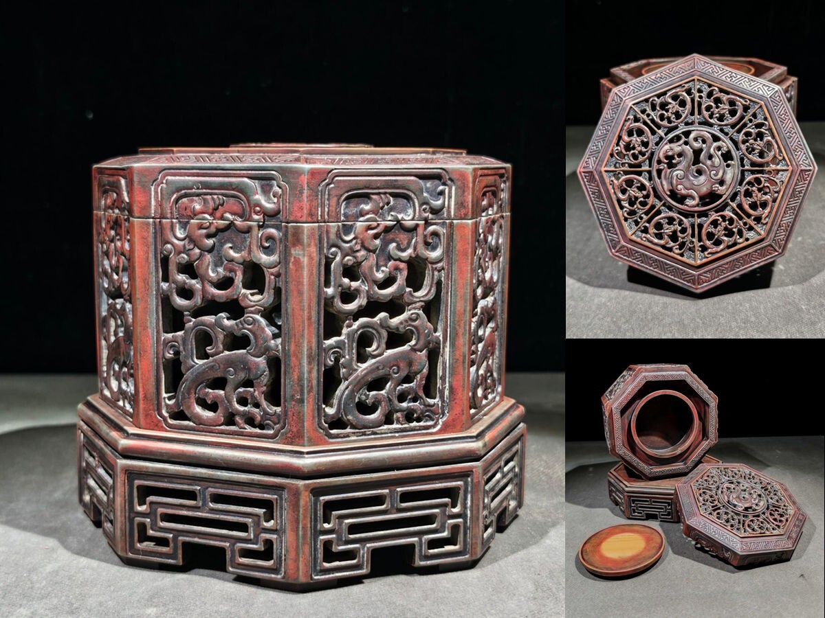 - 【瓏】松花石彫 魑龍紋 八角形文房套硯 朱硯 御筆 咸豐銘 清時代 手彫り 文房四寶 書道具 中国古硯 古美術 蔵出