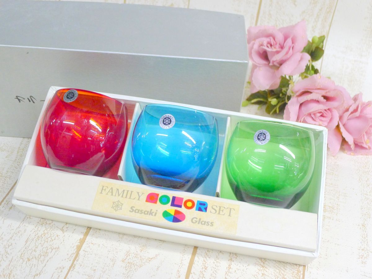 - i◆321 佐々木硝子 FAMILY COLOR SET ロックグラス ガラスコップ 赤色 青色 緑色 /80