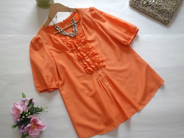 - スーナウーナ Sunauna ★5分袖フリルブラウス★お顔周りを華やかにオレンジ色★サイズ38