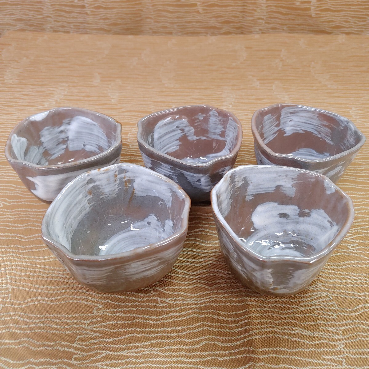 - 【陶器 変形 小鉢 5客】中古品 和食器 煮物 副菜 茶色 白色 食器 お皿【B8-3③】0916