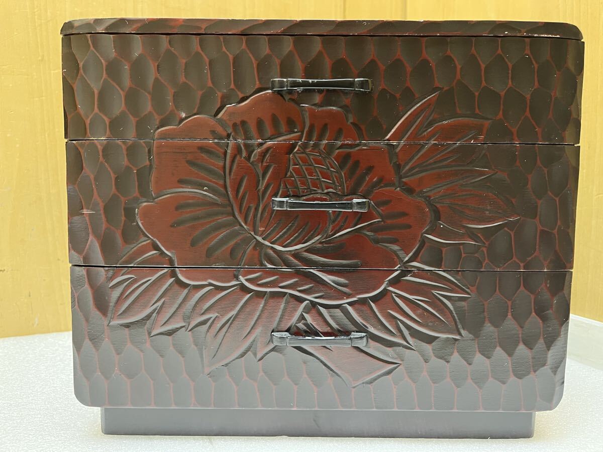 > XL0016 昭和レトロ 鎌倉彫 木製 3段引き出し 高さ約25.5cm 幅約30.3*21.5cm ミニ箪笥 小物入れ 伝統工芸品 収納 和家具 インテリア雑貨