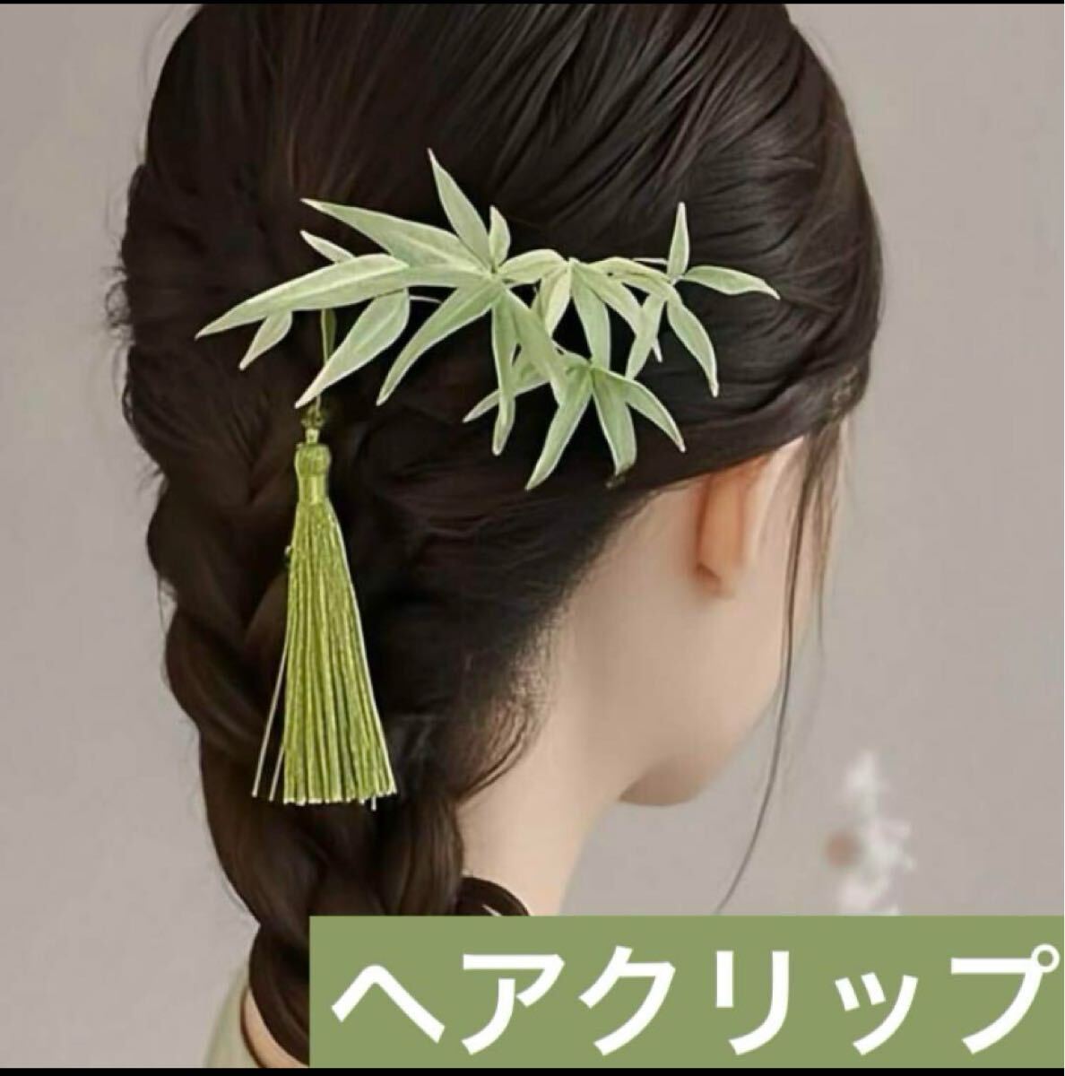 - 中国風 笹 ワッペン グリーン ゆらゆら タッセル ヘアクリップ