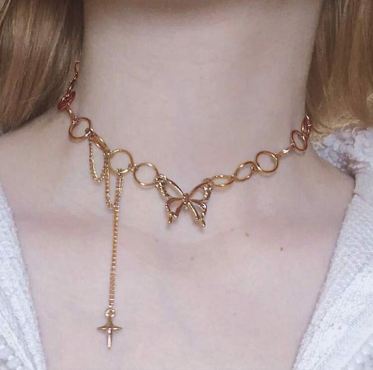 - ゴスロリ ロック 蝶々 チェーン リング ネックレス ゴールド