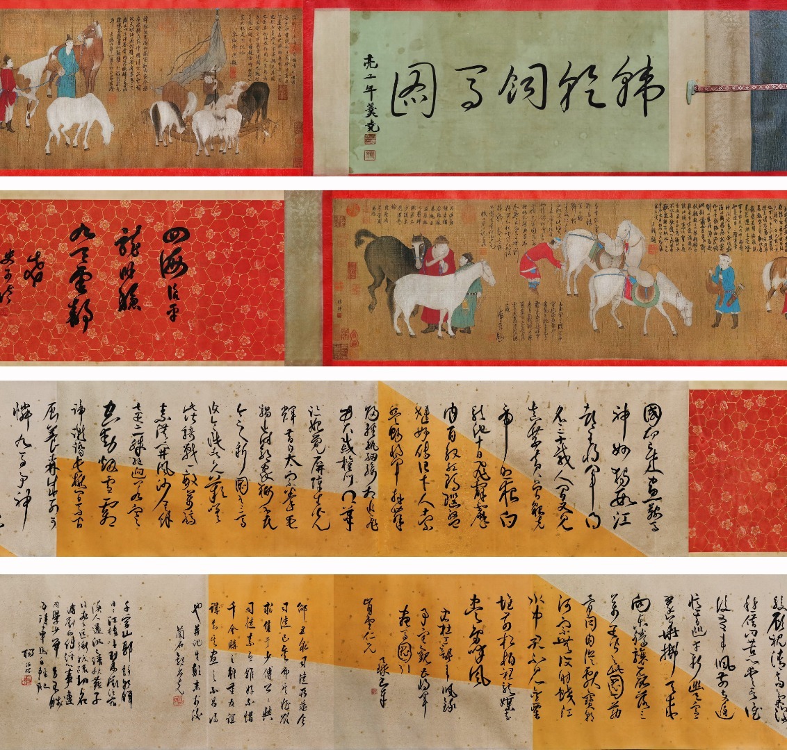 > 古美術 長巻 中国・唐時代 「韓幹書」 絹本 【飼馬図】 手巻 軸装 書道 巻き物 真筆逸品 肉筆保証 唐物 古画 LT-250968