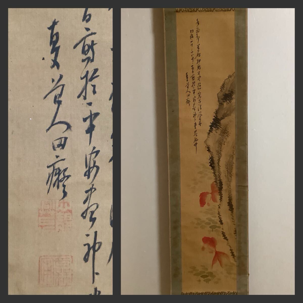 > 【模写】掛軸Sep756B[田能村直入 山水図 金魚図]絹本 書いたもの 木箱/日本画 幕末明治期 文人画家 南画家 竹田の養子 癡