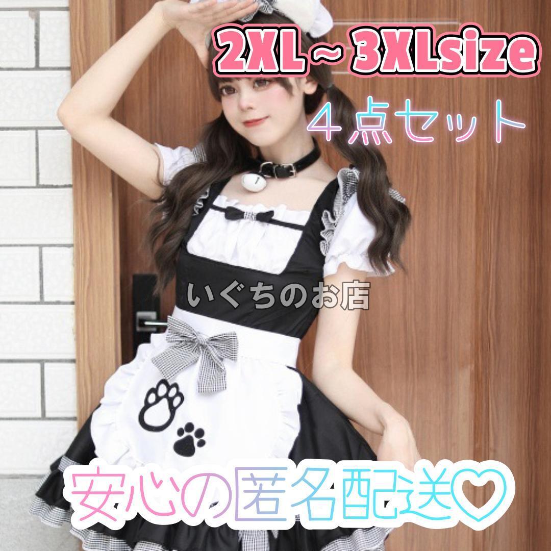 - 2XL 3XL メイド服 コスプレ セクシー 猫 チェック ゴスロリ ブラック フリル リボン カチューシャ