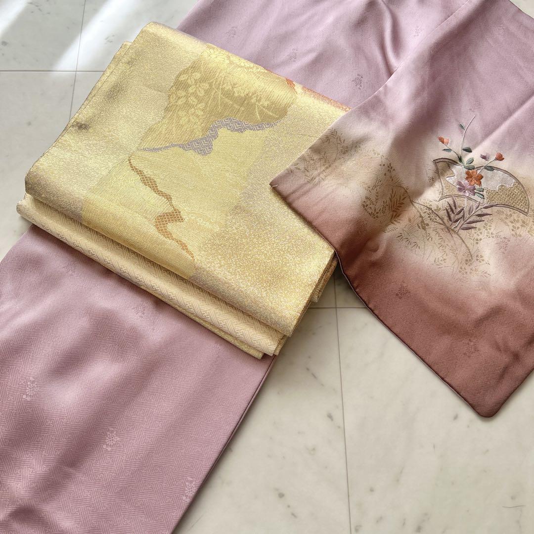 - 優美な正絹訪問着 撫子色 金彩 刺繍 160cm 花文様が華やかな一枚