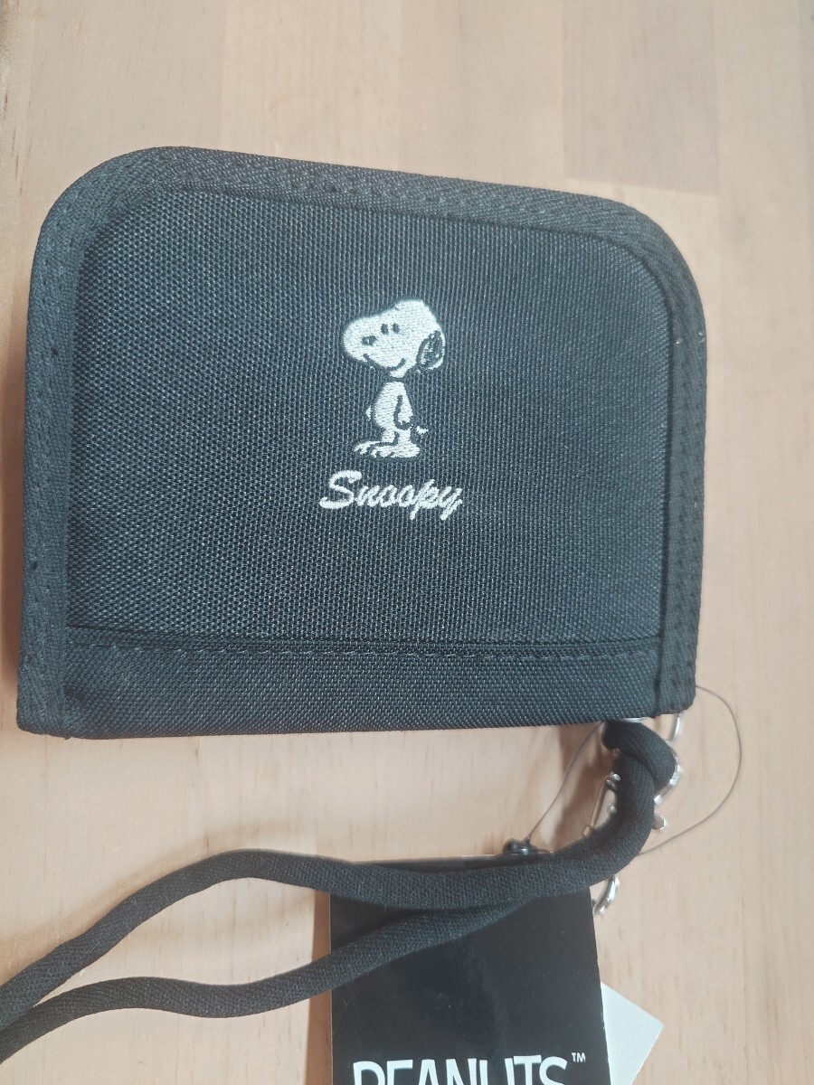- 新品☆刺繍スヌーピー二つ折り財布 ネックストラップ付き黒 メンズ男の子