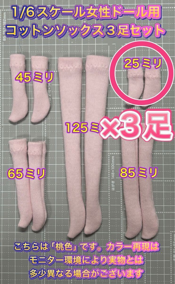 - 【即決】同じ長さ3足セット★ジェニー・リカちゃん・オビツなど1/6女性ドール用★コットンソックス桃色・約25ミリ
