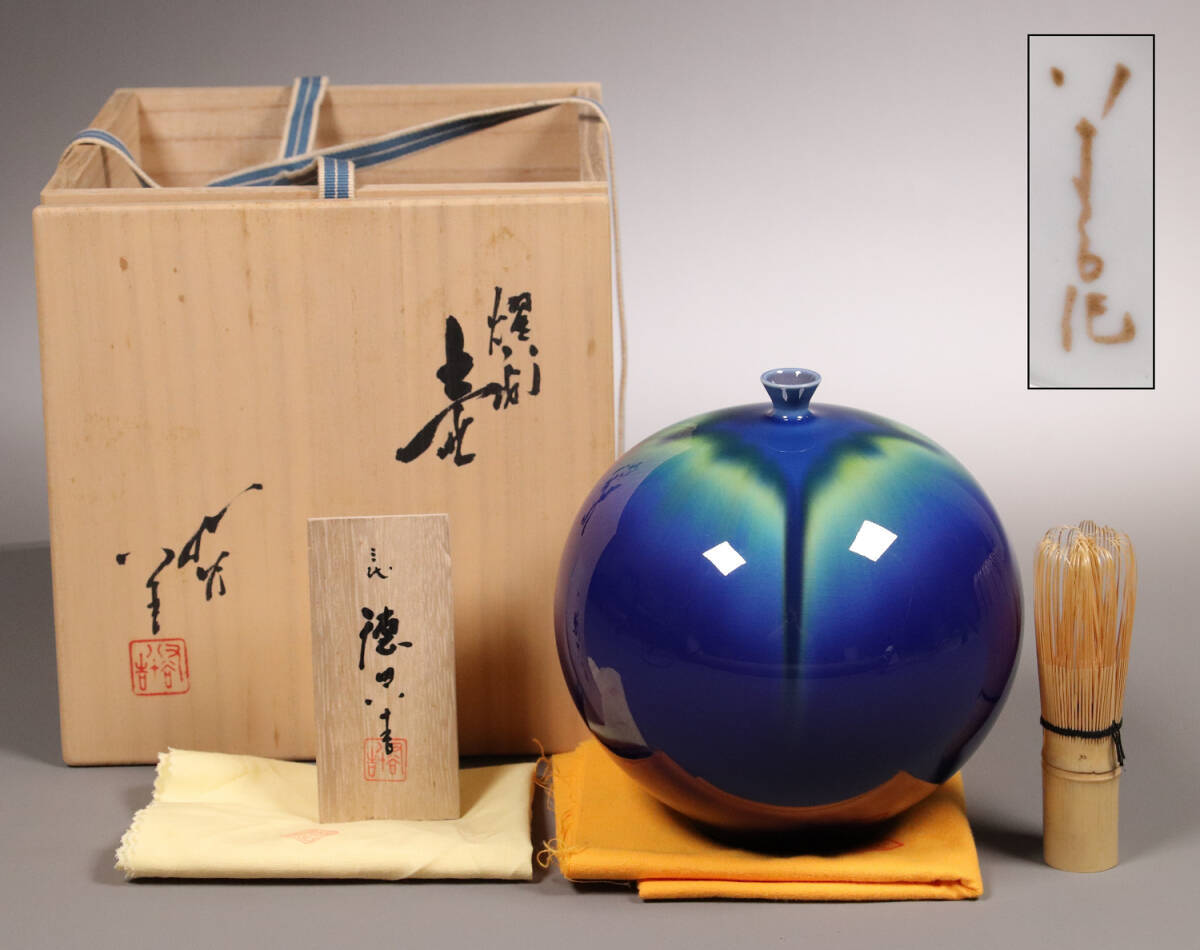 - 人間国宝 三代 徳田八十吉 耀彩壷 金銘 晩年作 共箱 共布 立札 略歴 花瓶 飾壺 茶道具 九谷焼 M903