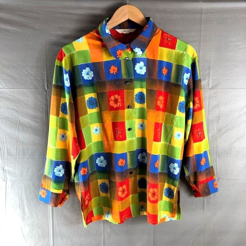 - ギビー Givy シャツ カラフル 柄模様 花 スクエア 肩パット 長袖 日本製 サイドスリット 青 赤 オレンジ 2025082900367