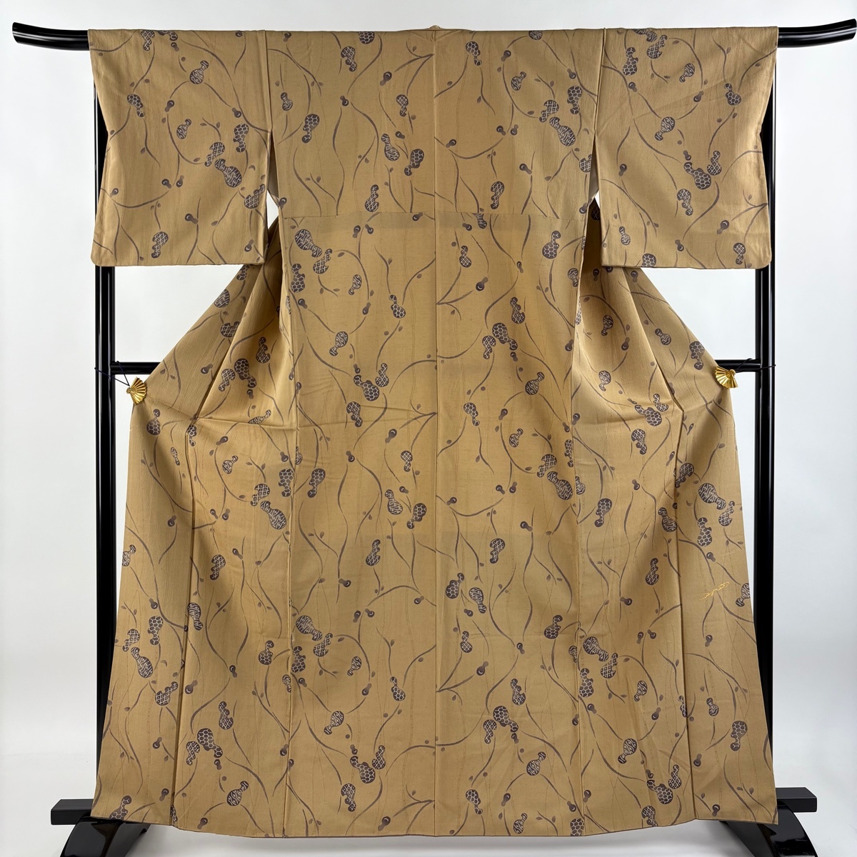 - 小紋 身丈163cm 裄丈66.5cm M 袷 コシノヒロコ 紬地 瓢箪 よろけ縞 山吹茶色 正絹 美品 名品 【中古】