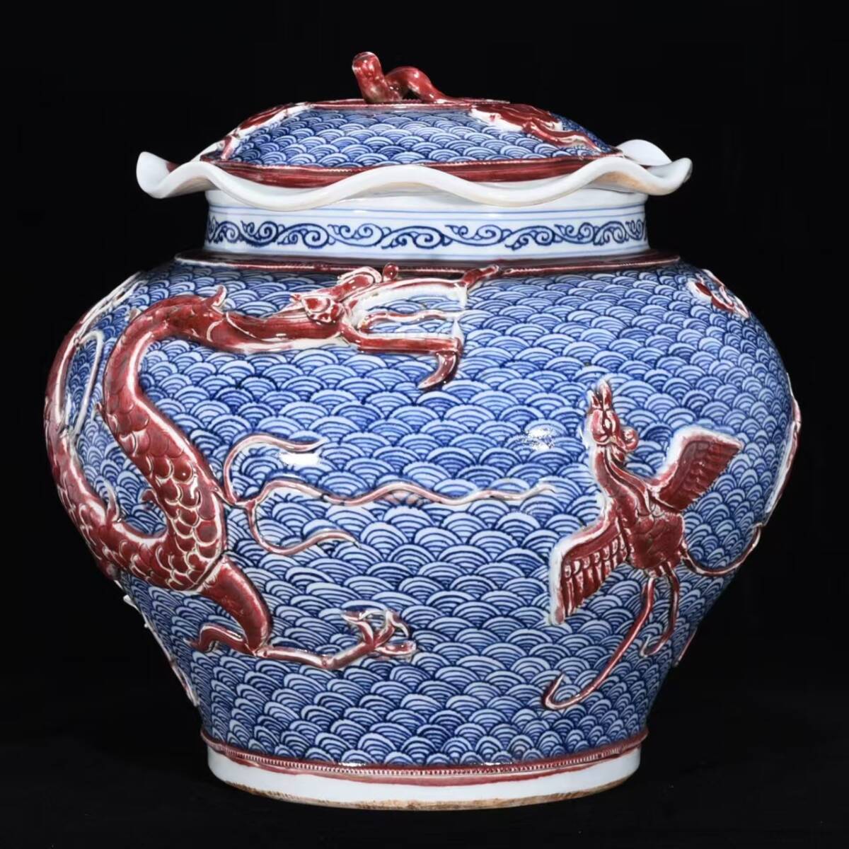 > 磁器 元時代 青花堆彫龍紋蓮葉形甕・缸 秘蔵 35cm古陶磁器 陶芸 唐物 古賞物 時代物 骨董品 古置物 極細工 中国磁器 古美味 中国古玩921