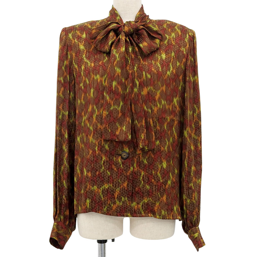 - 美品 GIVENCHY ジバンシー フランス製 リボンタイ 総柄 ブラウス トップス レディース シルク ブラウン系 40 ヴィンテージ
