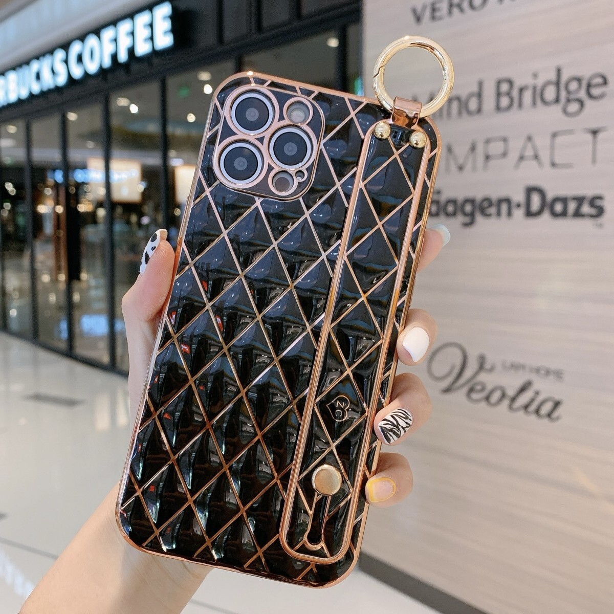 > 新品 アイホン ケース スマホ iPhone 12pro 12プロ 落下防止ベルト 高級感 アイフォーン ブラック 黒 光沢 格子柄 マトラッセ
