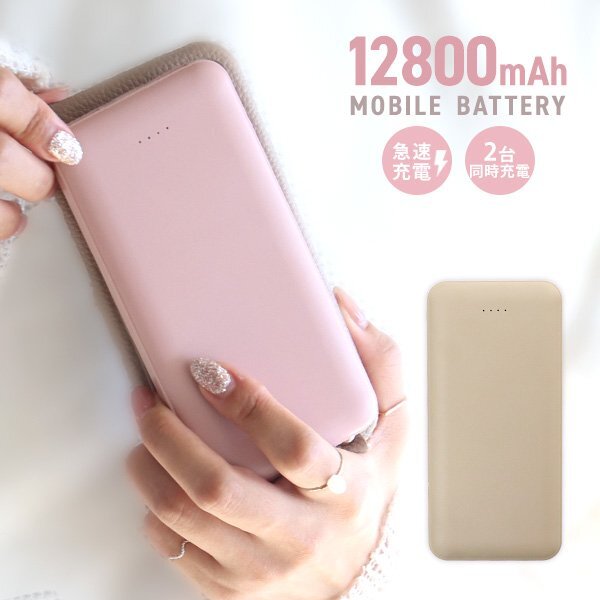 > モバイルバッテリー 急速充電 12800mAh 大容量 2台同時 PSE認証 スマホ iPhone iPad Android LED残量表示 防災 充電器 ミルクティ