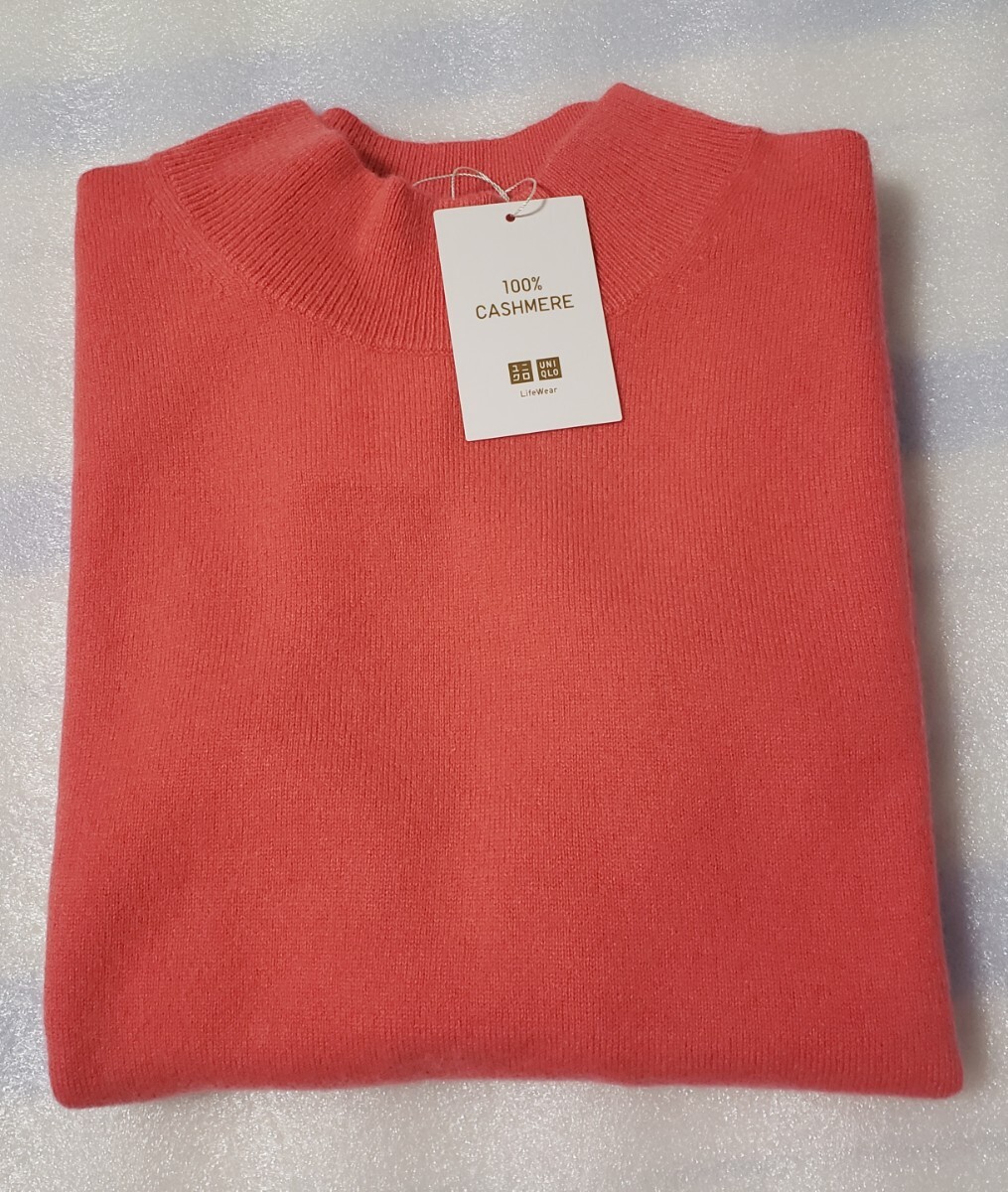 > Lサイズ 新品 ユニクロ カシミヤ100% モックネックセーター 5分袖 オレンジ(ピンクを混ぜたような色味 uniqlo ニット 手洗い可 送料無料