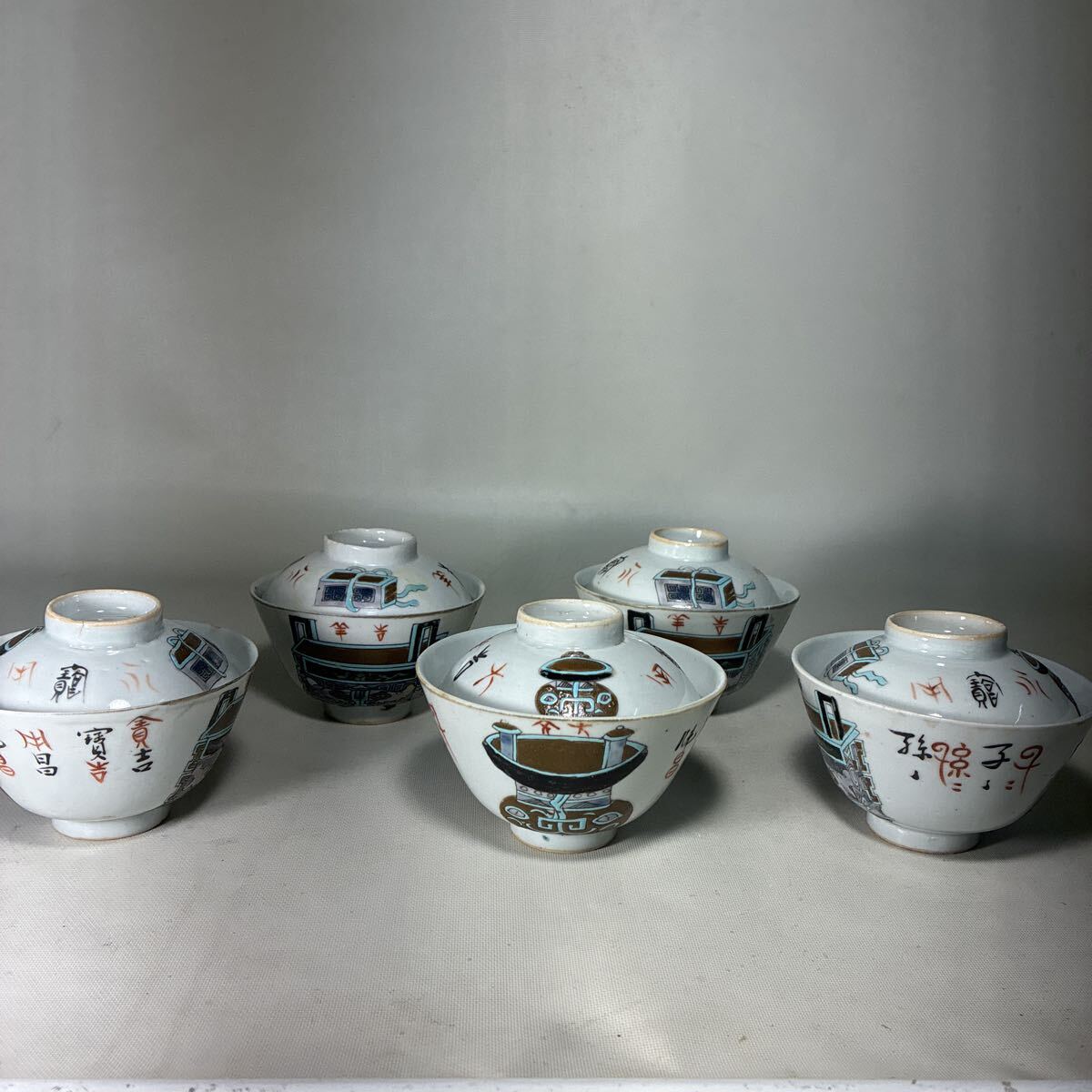 - 中国美術 中国粉彩磁器 無双譜茶碗 清朝磁器 蓋付茶碗 5客揃い 蓋付