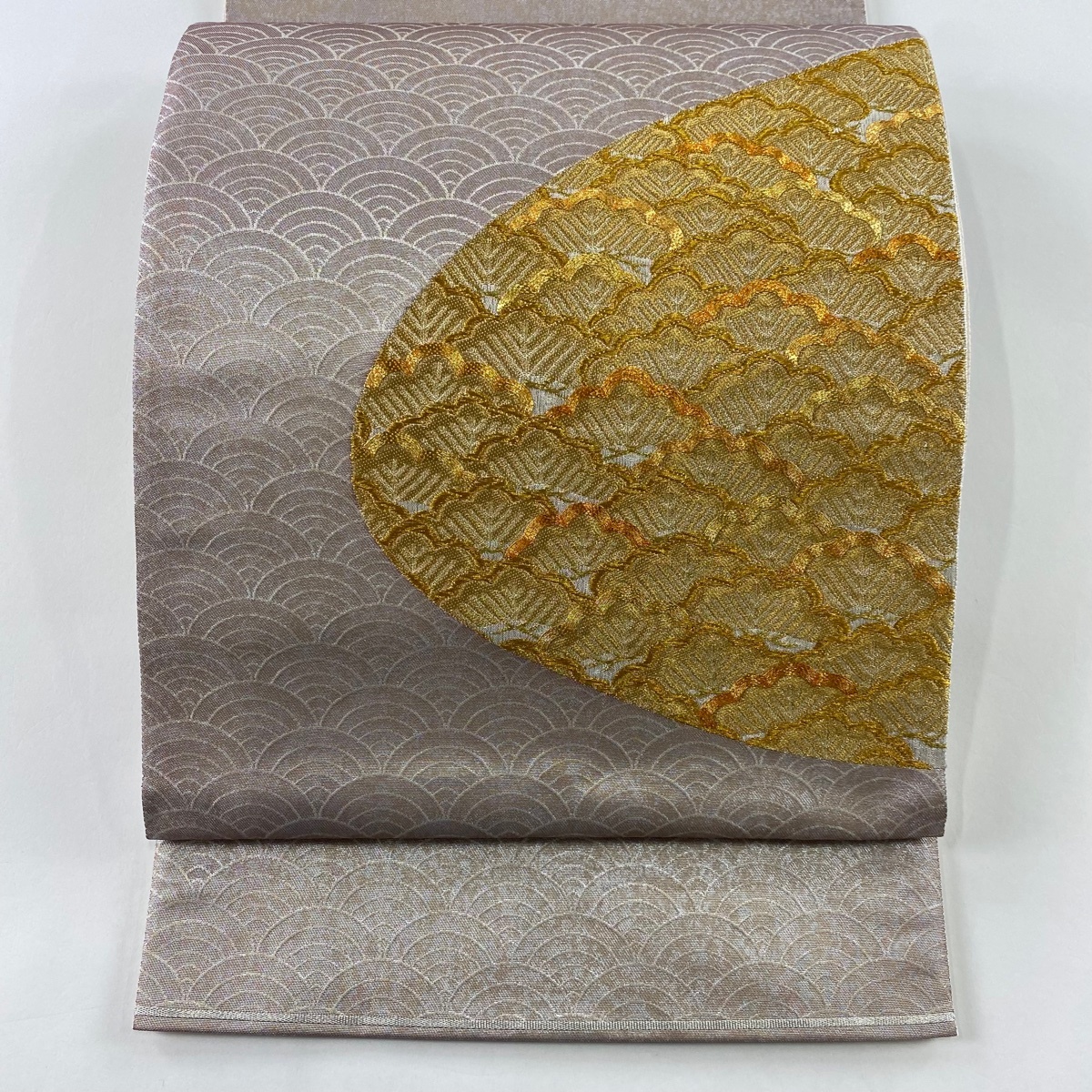 > 袋帯 美品 秀品 関西仕立て 笠松 青海波 金糸 箔 ピンクベージュ お太鼓柄 正絹 【中古】
