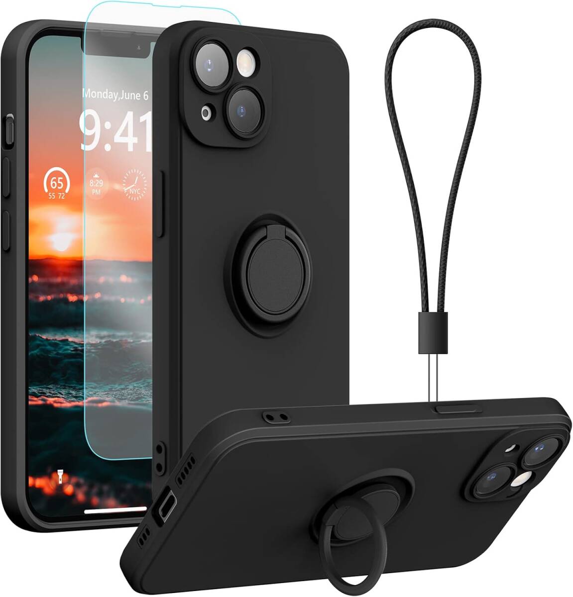 > pcgaga iPhone 14 pro ケース ガラスフィルム付き リングホルダー スタンド付き シリコン製 カメラ保護付き (ブラック)