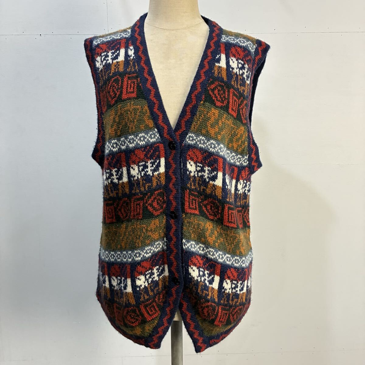- 極上 アルパカニット ペルー製 ニットベスト Vネックニット 総柄ニット 幾何学模様 エスニック alpaca100% 民族調【送料一律/同梱可能】P