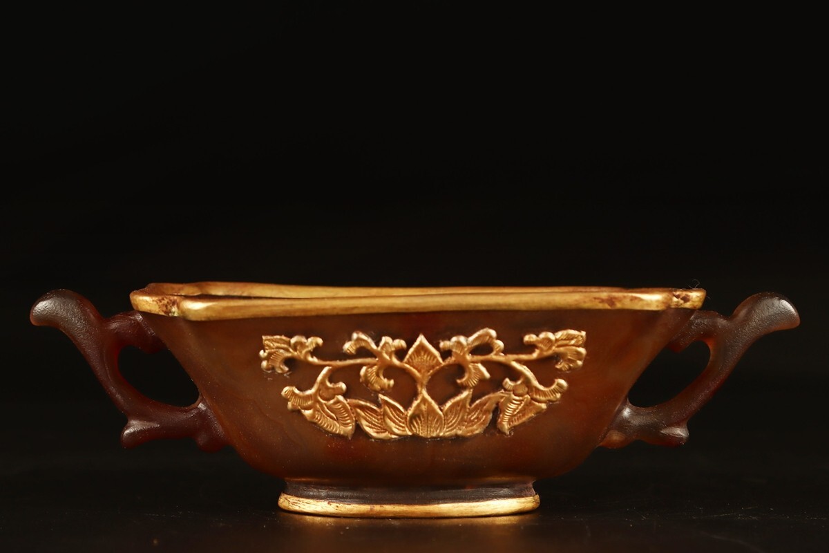 - 「戦國時期 瑪瑙彫り 包金双耳杯」極細工 擺件 古賞物 中国古美術 旧蔵出