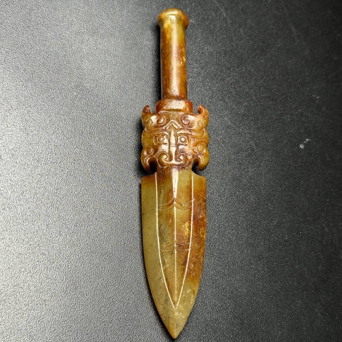 - 蔵友旧蔵出 和田玉製 細密彫 古玉 饕餮紋 匕首 盒付 玉質細膩 希少珍品 貴重品 置物 古賞物 中国古玩 中国古美術品