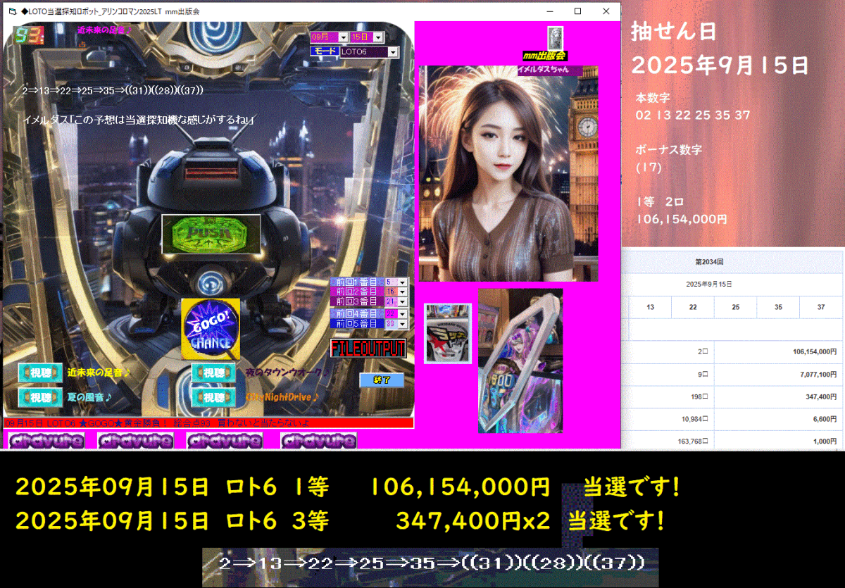 新作 [◆LOTO当選探知ロボット_アリンコロマン2025LT] ロト予想ソフトをご案内申し上げます。 予想ソフトのLOTO当選探知ロボットがイメルダスちゃんとコラボを実現! 最強ソフトのロト6 ロト7 ミニロトフォーメーション予想版シリーズがまた登場! 美人インストラクターのイメルダスちゃん(東洋一の美人)が高額当選を予感!!! 玉突き2回連続、ロト6は2連続の高額当選中です!!2025年09月18日 ロト6 2等 6,565,600円 当選です!2025年09月18日 ロト6 3等 223,100円x3 当選です!2025年09月15日 ロト6 1等 106,154,000円 当選です!2025年09月15日 ロト6 3等 347,400円x2 当選です!美人インストラクターのイメルダスちゃんが当てまくりです!ロト6は2連続の高額当選は、結構珍しい記録だと思います。「ラッキートリガー」発動で、1800万円以上当選の87%期待度になります。 このスペックは、ロト予想界史上で歴史的にも最強仕様の名機となります。今主流の「先ばれ告知音」が鳴れば、更に高額当選濃厚! 美人インストラクター振りは、実績と仕様が示す通りです。特にロト6の女性美人インストラクターのアイドル?!イメルダスちゃんが激熱!!2025年09月18日 ロト6 2等 6,565,600円 当選です!2025年09月18日 ロト6 3等 223,100円x3 当選です![◆LOTO当選探知ロボット_アリンコロマン2025LT]09月18日 LOTO6 ☆GOGO☆金色になれミ 総合点87 やや控えめに! [◆LOTO当選探知ロボット_アリンコロマン2025LT][5⇒21⇒35⇒10⇒17⇒((33))((38))((29))((9))][◆LOTO当選探知ロボット_アリンコロマン2025LT][イメルダス「この予想は当選探知機な感じがするね!」][◆LOTO当選探知ロボット_アリンコロマン2025LT]イメルダス「今日も期待するわよ♪」2025年09月15日 ロト6 1等 106,154,000円 当選です!2025年09月15日 ロト6 3等 347,400円x2 当選です![◆LOTO当選探知ロボット_アリンコロマン2025LT]09月15日 LOTO6 ★GOGO★黄金勝負! 総合点93 買わないと当たらないよ[◆LOTO当選探知ロボット_アリンコロマン2025LT][2⇒13⇒22⇒25⇒35⇒((31))((28))((37))][◆LOTO当選探知ロボット_アリンコロマン2025LT][イメルダス「この予想は当選探知機な感じがするね!」][◆LOTO当選探知ロボット_アリンコロマン2025LT]イメルダス「今日も期待するわよ♪」今回は、新機能、業界開発の機能を2つ搭載しています!二つ目が、「ラッキートリガー」発動で、1800万円以上当選の87%期待度になります。インストラクターのアイドル?!イメルダスちゃんがセリフリアクションで的確に当選を明示!!・買い目は、全てのロト基本 1点(予想にもボーナス数字を含むため)、実質 LOTO6 3点、LOTO7 3点、ミニLOTO 4点 です。 条件により、倍の数の買い目が出ることが御座います。(新機能が目白押し)あなた様も、今日からでも、一つロトで楽しみを持つのも、どうですか。もうすでに人生が楽しく変わっています。LOTO6 LOTO7 ミニロト 予想ができます。ロト6 2連続 高額当選でした♪ ロト6 3連続 高額当選ですと、次は3億円ぐらいですかね? 来そうです・・・ 9/18 現在キャリーオーバー 196,961,791円 4億円ぐらい狙って 2口ぐらい貼って勝負したいですね!!!今回は、特典グラビア イメルダスちゃんの画像が観れる機能が付いています もーイメルダスちゃんに、身も心もまかせちゃってください。 強い予告演出は、イメルダスちゃん、レインボー、激熱、神回!?このツールは、診断チェック機能を装備した、予想ソフトです。 1.買いたいロト券が、本当に信頼できるのか、ガチで勝負しても、大丈夫なのか? 2.買い目を数点に絞りたいが、有望な勝負できる数字を、知っておきたい。 3.ロト67、ミニで買いたいが、1、2点で勝負に適した買い目を知りたい。 要は、このソフト 一点一点の買い目の診断と、勝負になる絞った予想の買い目も出してくれます。 診断した買い目の総合の評価点数や、どんな勝負度合いが良いかの指示も出ます。実際に、どんな当て方を過去にこの予想ツールがしてきたのかを、ご説明いたします。こんなシンプルなツールで、こんなに高配当などが立て続けに当たるのですから、楽です。[[◆LOTO当選探知ロボット_アリンコロマン2025LTの具体的仕様な説明]]・このソフトは、パソコンWindows版の全てに対応しています。Xp Vista 7 8 8.1 10 11動作確認済み ・買い目は、全てのロト基本 1点(予想にもボーナス数字を含むため)、実質 LOTO6 3点、LOTO7 3点、ミニLOTO 4点 です。・条件により、倍の数の買い目が出ることが御座います。基本点数とは異なる数の予想数になることがあります。・熱い予告の時に、金の延べ棒、★GOGO★ランプも点灯します。・新機能、業界開発の「先ばれ告知音」機能を搭載しています!・新機能、業界開発の「ラッキートリガー」発動で1800万円以上当選の87%期待度になります。・イメルダスちゃんが、本来持つあなたの強運を引き出そうと暖かい励ましでメッセージを言ってくれます。・特典グラビア イメルダスちゃんの画像が観れる機能が付いています 【演出別期待度】 レインボー☆ レインボー実写☆☆ レインボー☆☆☆ ・買い目の一つ一つについて診断が出来る予想ツールで