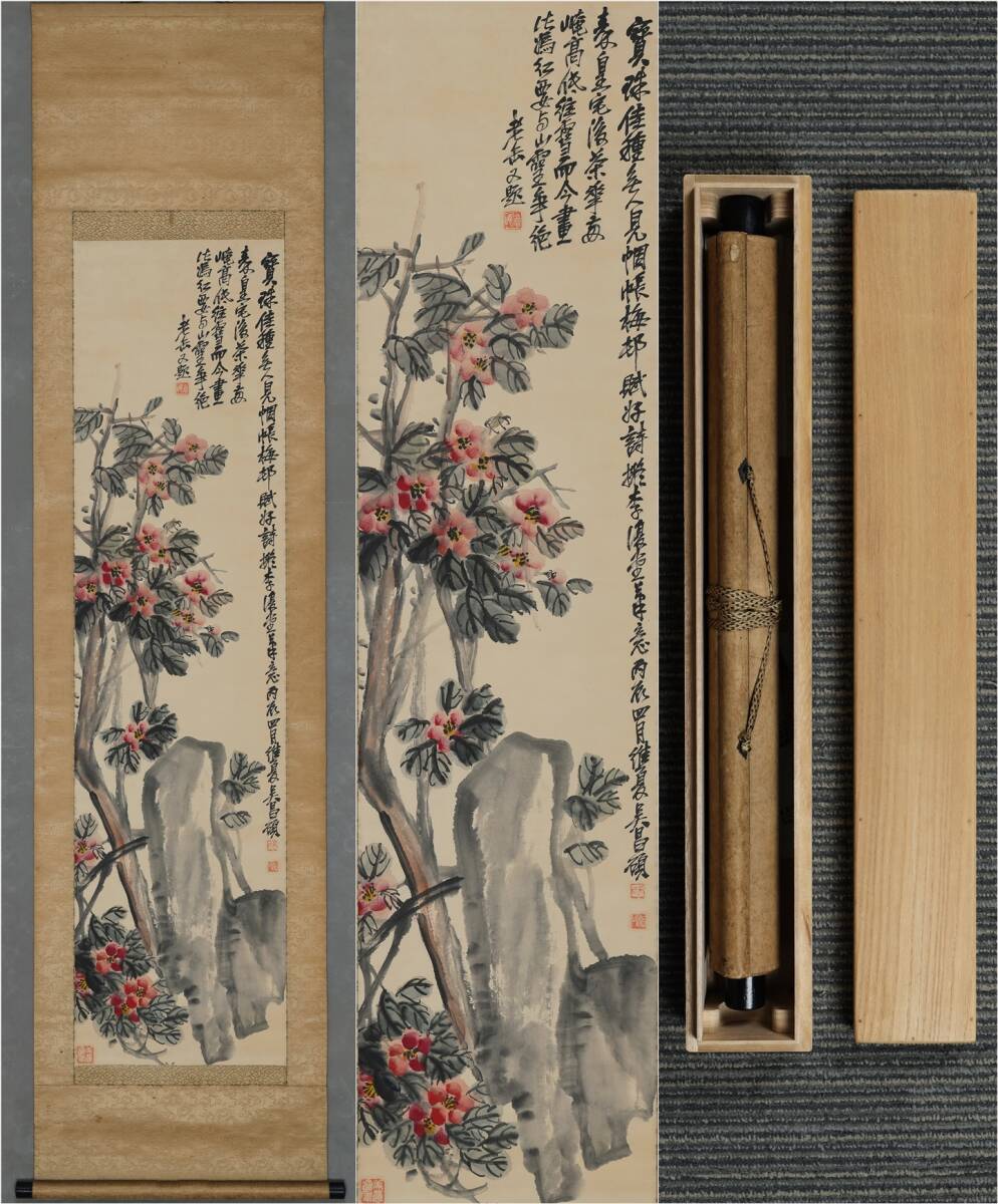 - 古美術 掛け軸 中国・近現代 「呉昌碩書」 紙本 【茶花図】 立軸 書道 巻き物 付木箱 肉筆保証 唐物 古画 画心132x34cm LT-2509103