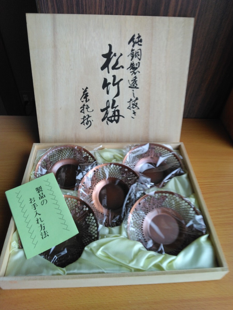 - 純銅 純銅製茶托揃 松竹梅刻刀 透かし抜き 五枚セット 共箱 伝統工芸 未使用保管品