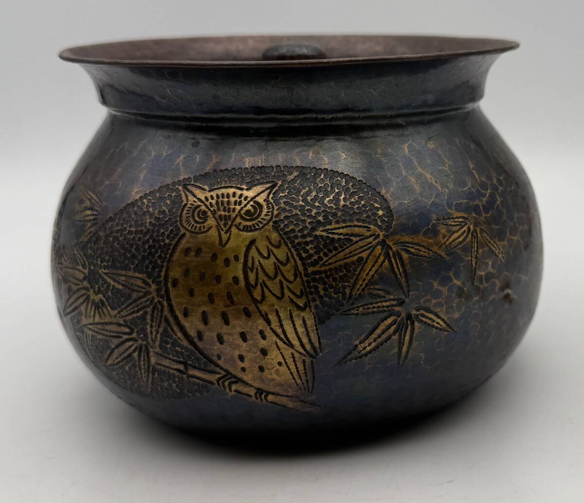 - 芳燕堂 造 鎚起銅器 梟 図 建水 茶こぼし 鎚目 茶道具 煎茶道具 古道具 道具 骨董 当時 時代 茶の間 和風 日本 工芸