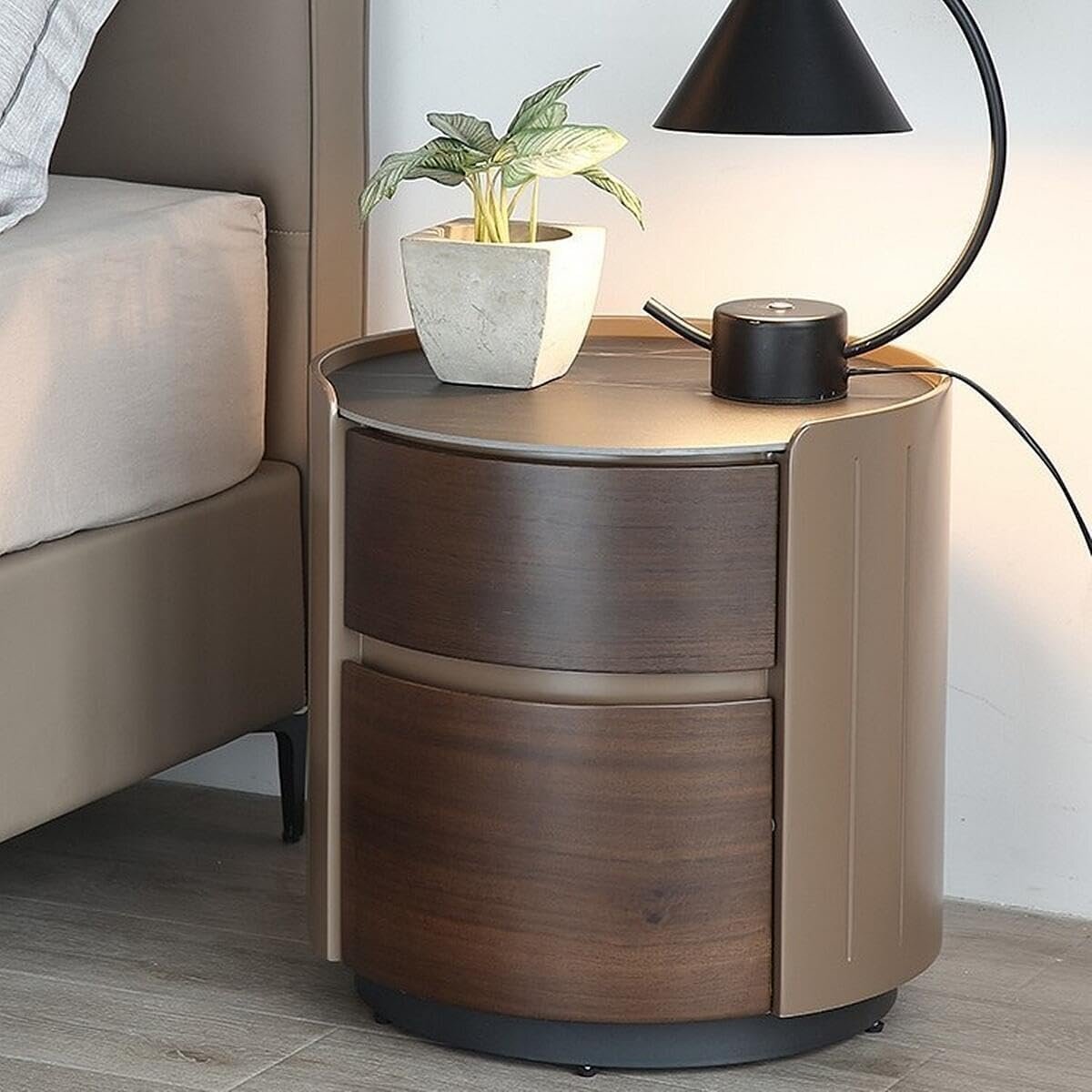 > ベッドサイドテーブル 無垢材 ナイトテーブル おしゃれ 北欧 高級 収納 丸い引き出し 電話台 ソファーサイド ベッド周り収納 (木の色)