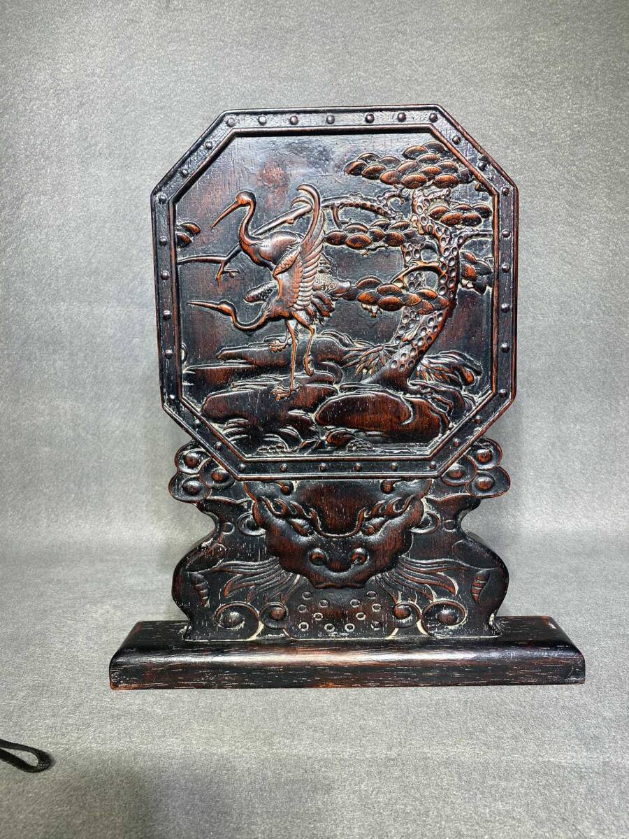 - 清時代 古紫檀木彫 松鶴延年 插屏 屏風 擺件 古玩家具 極細工 古賞物 古美味 東洋彫刻 時代物 骨董 中国古美術