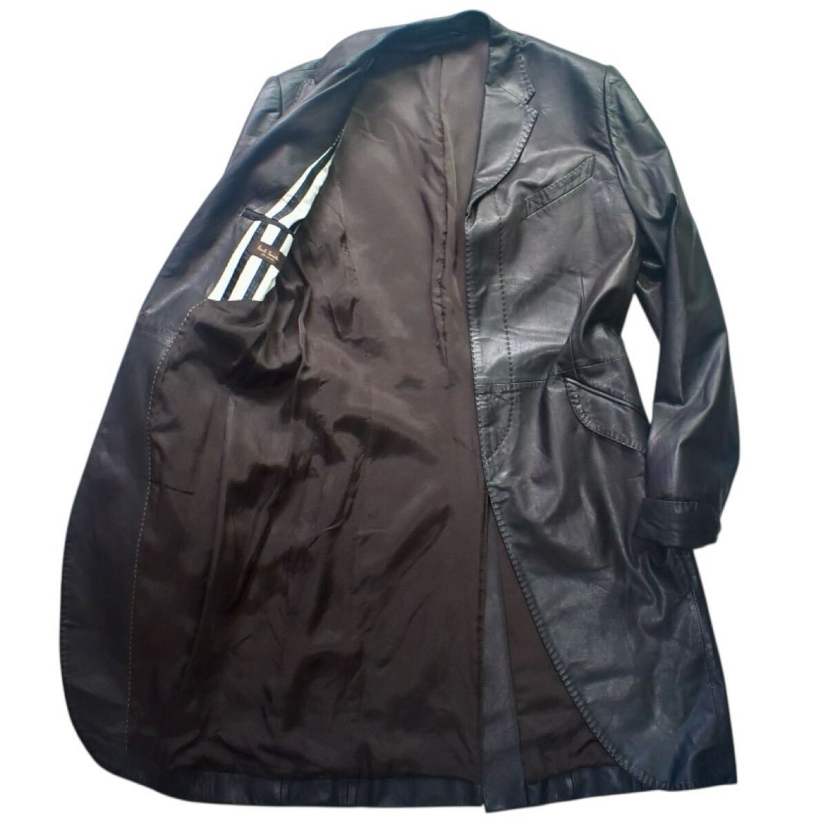 - ポールスミス コレクション ラムレザー ロングコート L 黒 裏地ストライプ 革