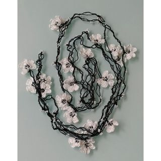 - R13-42 オヤ刺繍 フラワー刺繍 ラリエット ネックレス ホワイト 紐紺色