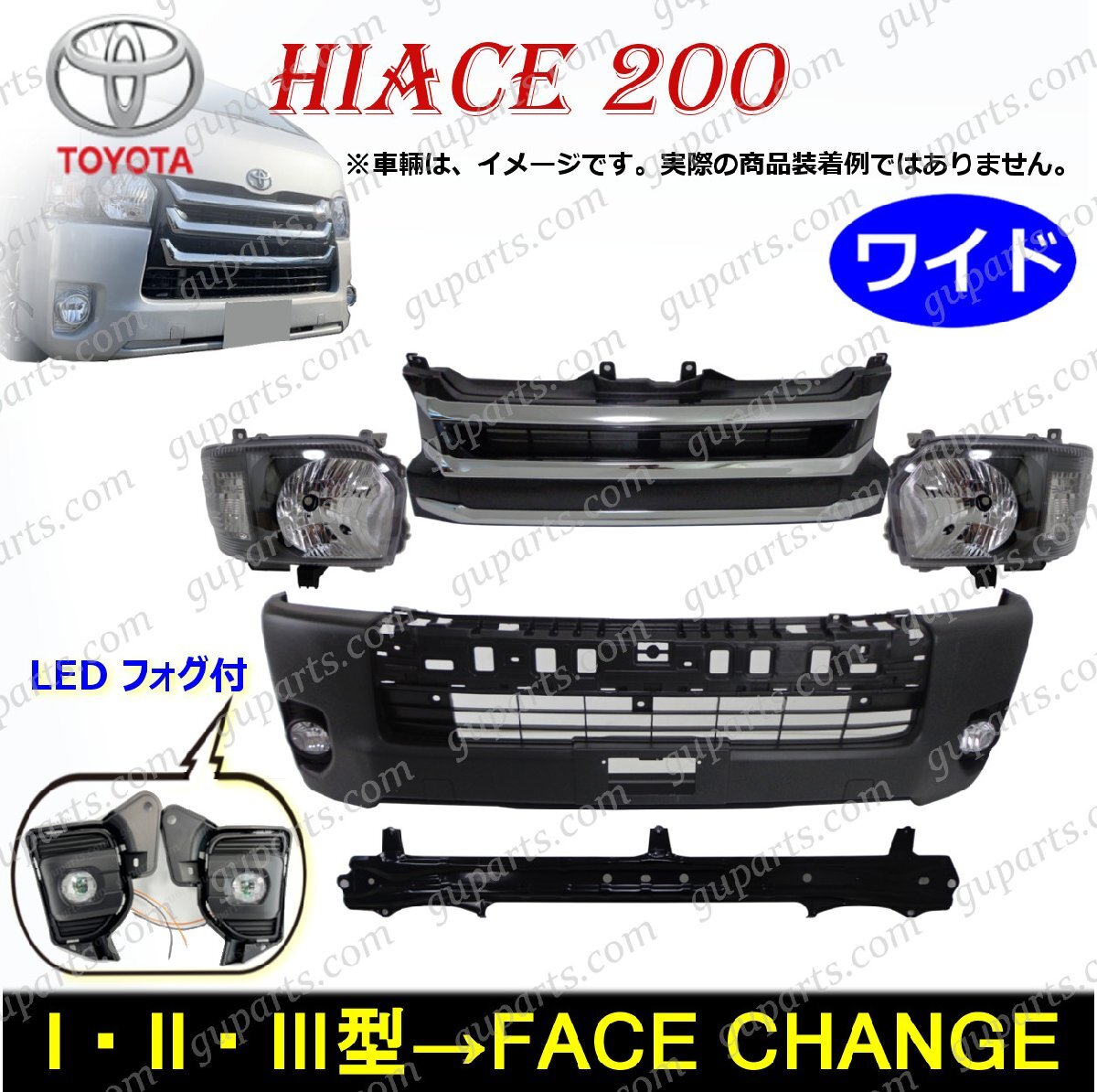 - ハイエース 200 4型 ワイド フェイスチェンジ ハロゲン ヘッドライト ブラック LEDフォグ フロントバンパー グリル キット 1型 2型 3型