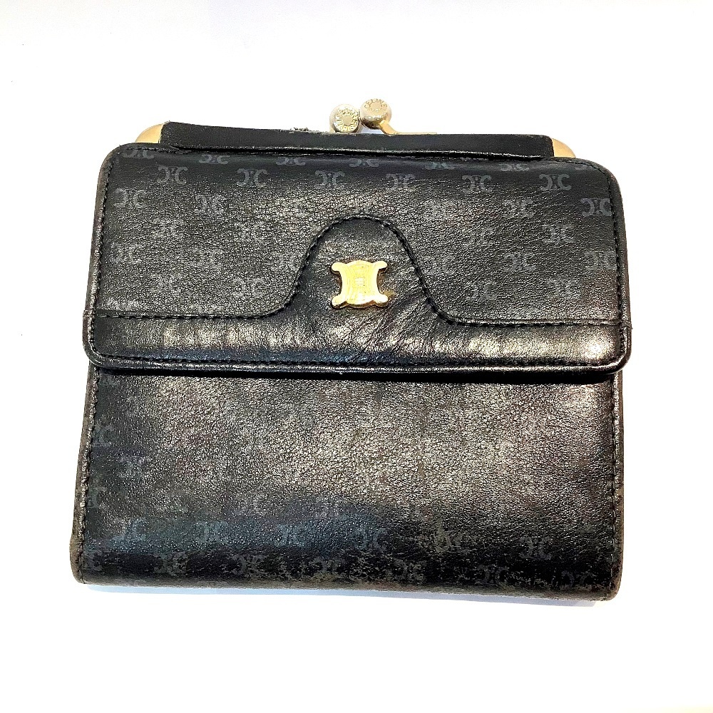 - セリーヌ CELINE ガマ口財布 折り財布 ネイビー×ブラック×ゴールド金具 マカダム トリオンフ ジャンク 【中古】KB-9461