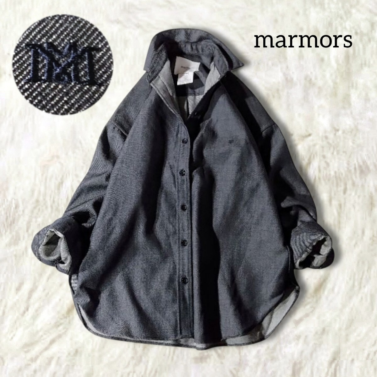- 69 【marmors】 マルモア オーバーサイズ シャツ ブラウス トップス 36 ネイビー 長袖 ゆったり 日本製 ウール ハリ感 ロゴ刺繍 秋冬