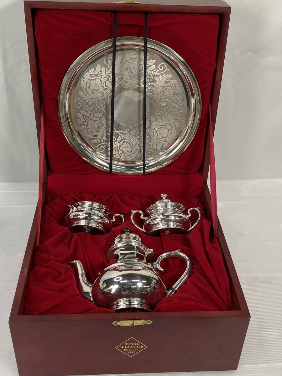 - 2509-206 Royal Selangor pewter ロイヤルセランゴール ピューター ティーセット ポット クリーマー シュガーポット トレー 錫 木箱付き
