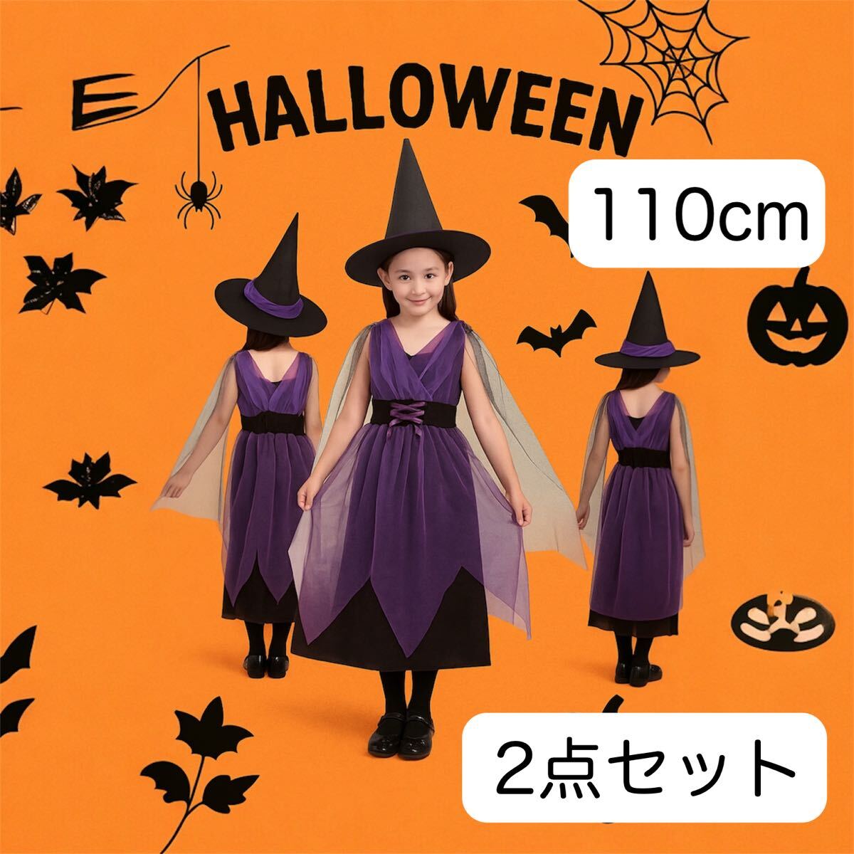 - セール 魔法使い コスプレ 110cm 2点 ワンピース 帽子 ハロウィン パープル キッズ 仮装