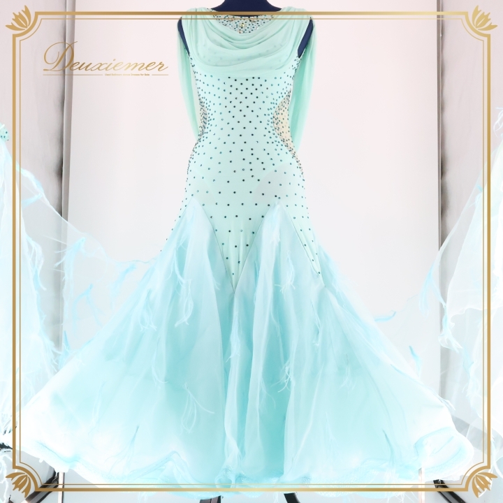 - 社交ダンス 衣装 スタンダード ドレス スタンダードドレス ワンピース 水色 羽 フロート 綺麗 パーティ 発表会 デモ 競技 ブルー系