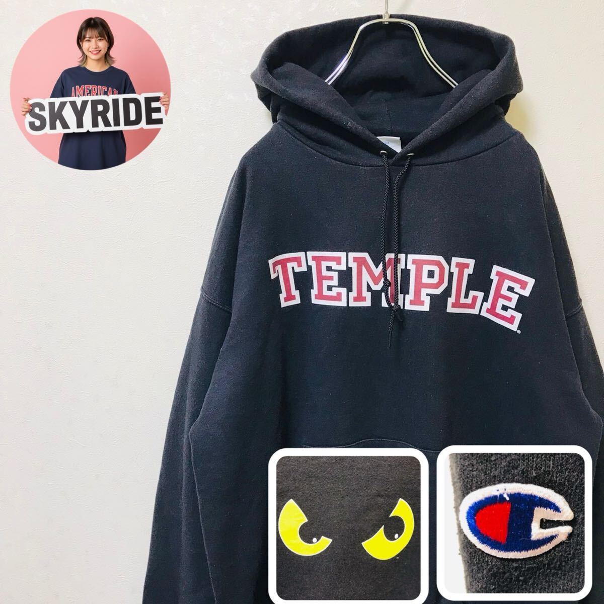 > 【定番】Champion チャンピオン プルオーバーパーカー カレッジロゴ ブラック L ビッグシルエット ゆるだぼ コットン混 古着 #TT0333