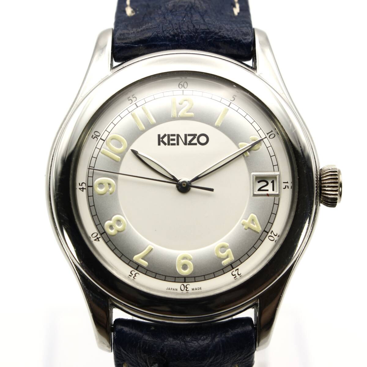 - 激レア KENZO 腕時計 メンズ クォーツ デイト レザーベルト 紺 ケンゾー KN-2023 ファッションウォッチ モード系ファッション 希少腕時計