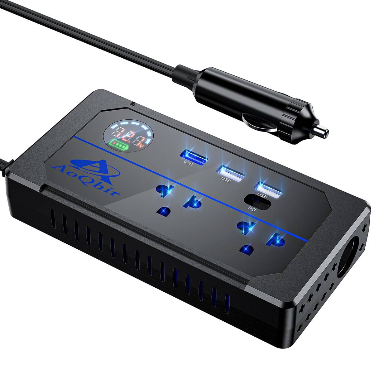- 3ポート QC3.0USB急速充電 USB DC12VをAC100Vに変換 AC100V電源2口 200W TYP-Cサポート コ
