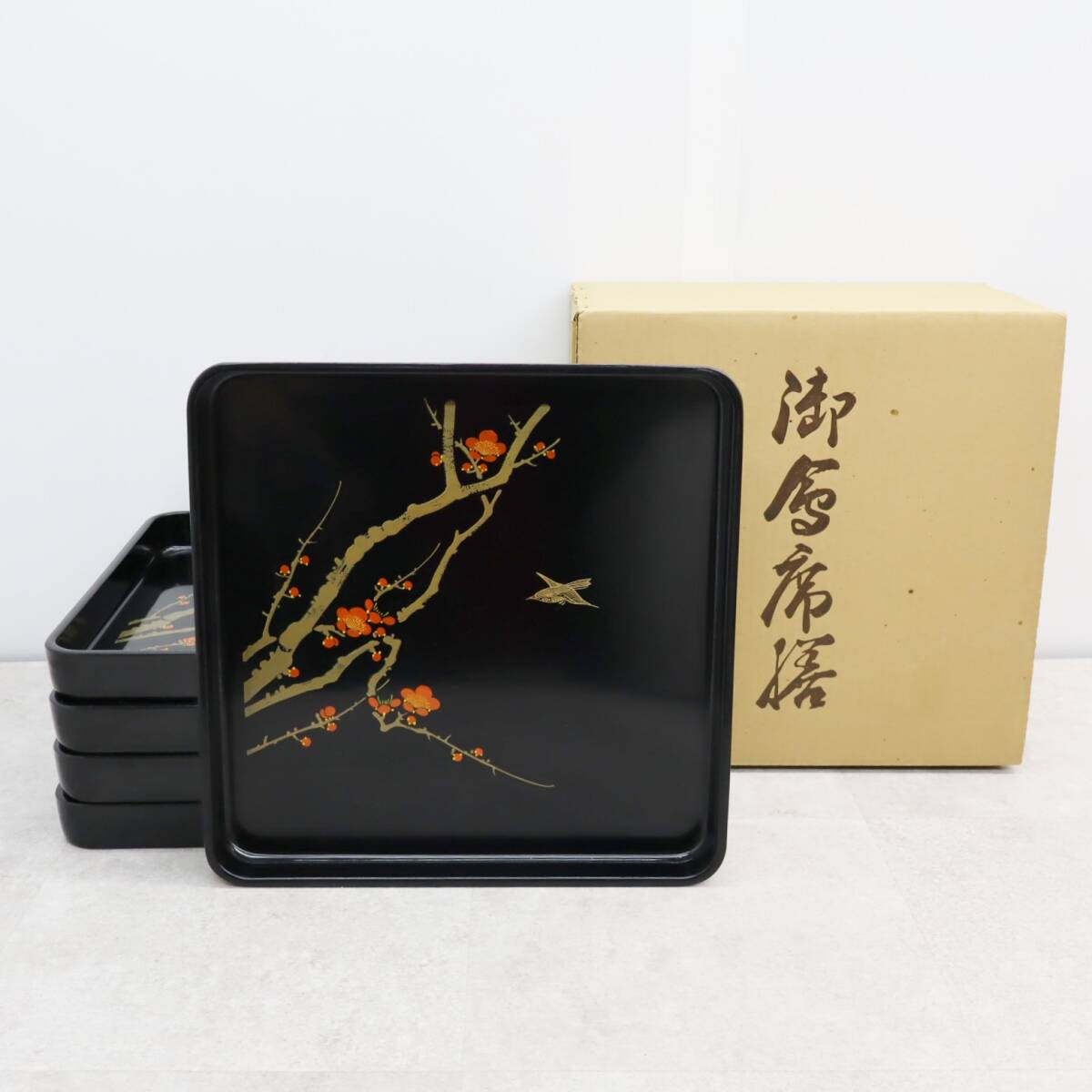 △美品 5枚セット|梅二鳥 漆器 御会席膳 お盆| |サイズ約 37×37cm ■P0074の出品です!