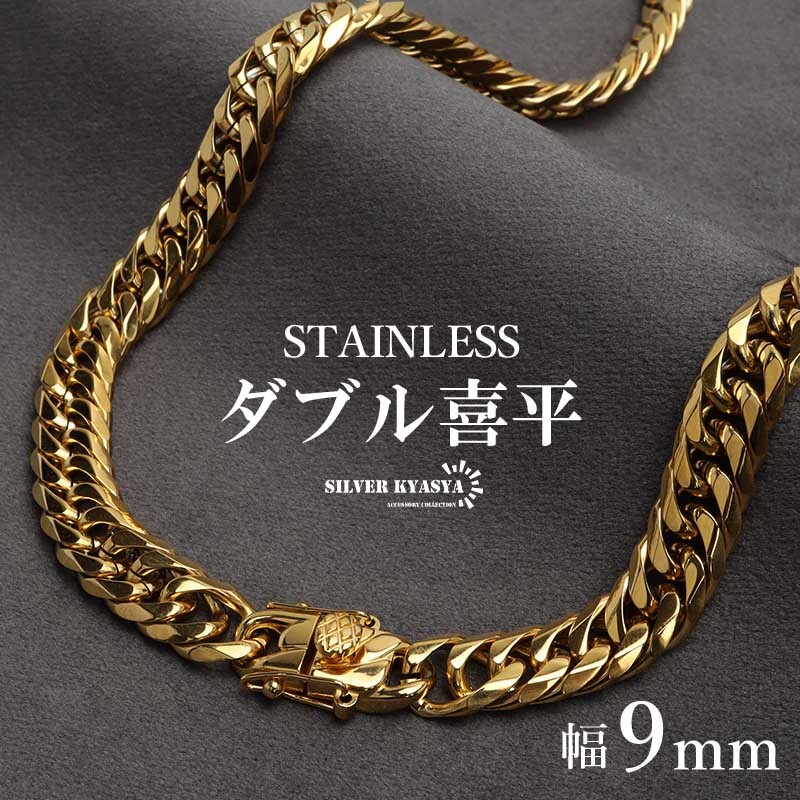 - (60cm) ステンレス製 ダブル喜平ネックレス ゴールド 18KGP 幅9mm マイアミチェーン 金アレ対応